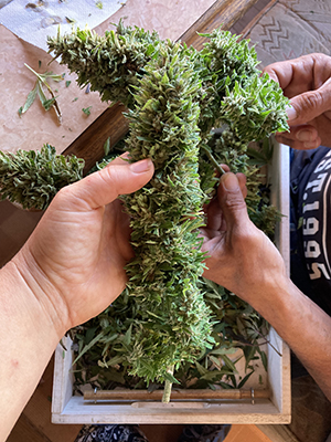 Parce qu'il ne suffit pas de recolter les inflorescences de chanvre pour obtenir de belles fleurs de CBDJe récolte les inflorescences de chanvre à maturité plant après plant puis je procède immédiatement à l’étape cruciale de la manucure, qui consiste à tailler les feuilles tout autour des inflorescences. Les inflorescences sont ensuite placé « tête en bas » dans le séchoir, ventilé naturellement : nous avons de la chance, la région ne manque jamais de vent